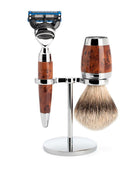 3-part shaving set without bowl, handles of thuja wood with chromed metal accents:
