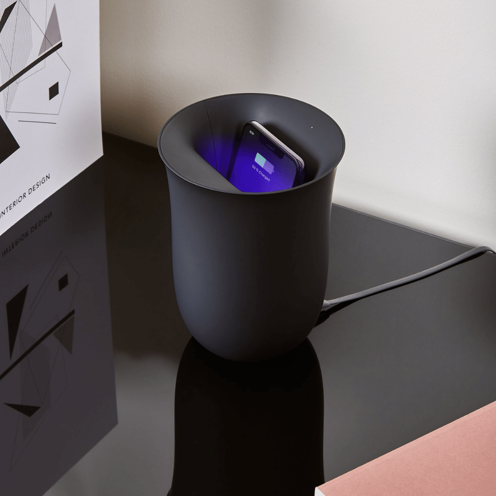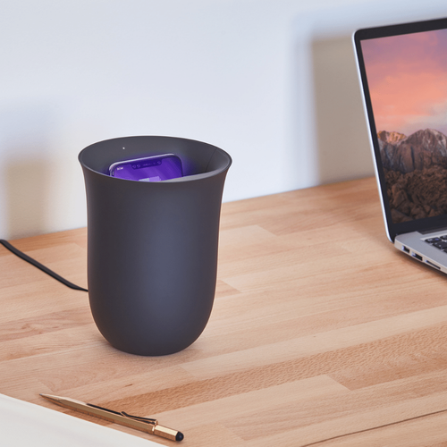 Oblio, akıllı telefonunuzu hem sterilize etmek hem de şarj etmek için güzel bir yerdir. Mobil cihazınıza kaçınılmaz olarak giren zararlı virüsleri ve bakterileri öldüren, vazo şeklinde tasarlanmış bir kablosuz şarj istasyonudur.